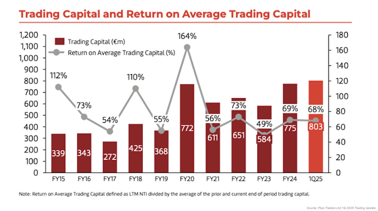 Management eventually realised that trading capital is the lifeblood of the firm, the fundamental constraint on profitability. The company had been in a self-defeating loop, distributing capital that could have compounded at attractive rates if retained and redeployed. Retaining capital would allow Flow Traders to take larger positions, provide liquidity across more products, absorb temporary hedging losses, and fully participate in volatile markets where opportunities multiply.