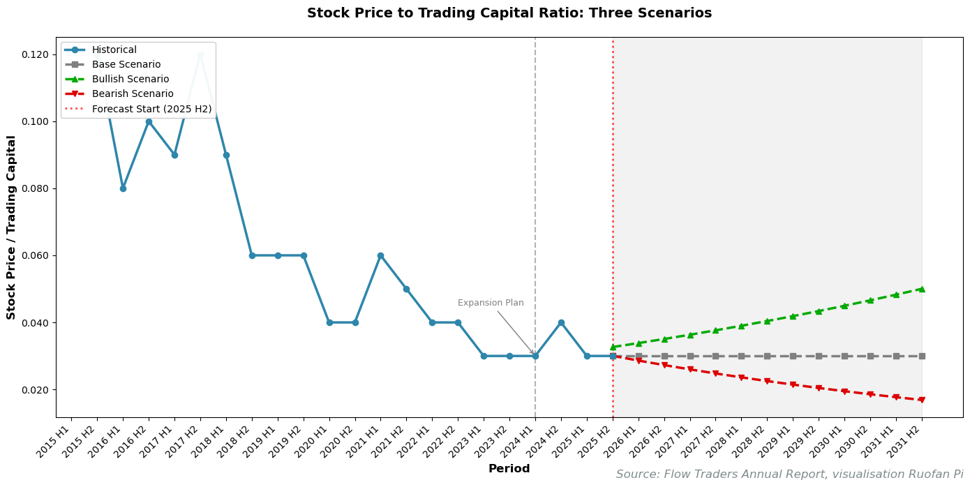 Instead, this analysis adopts a valuation multiple approach, similar in principle to a price-to-earnings (P/E) ratio, but based on trading capital. In Flow Traders’ case, trading capital is the key driver of profitability, the fundamental input that generates returns. The question becomes: what multiple should the market pay for each euro of trading capital, given the returns that capital can generate? This approach offers clarity by focusing on the stable, measurable input (capital deployed) rather than the volatile output (periodic earnings).