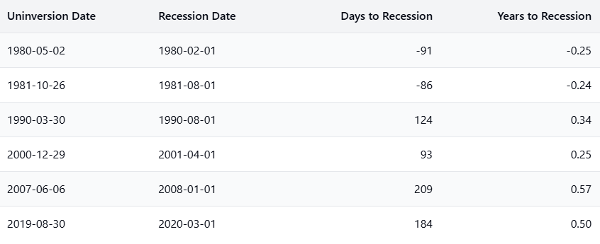 Looking at the historical data, we can observe a clear relationship between yield curve uninversion dates and subsequent recessions. The data from our analysis reveals a pattern worth examining: