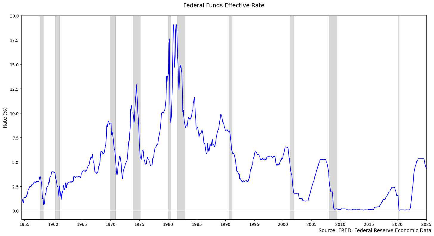 A soft landing represents one of the most challenging objectives in monetary policy - successfully transitioning an economy from a period of high growth and inflation to stable, sustainable growth without triggering a recession. The Federal Reserve has been pursuing this goal through an aggressive interest rate policy, as clearly visible in Figure 1, where we can see one of the steepest rate hiking cycles in recent decades, with the Federal Funds Rate climbing rapidly from near-zero to exceed 5%.