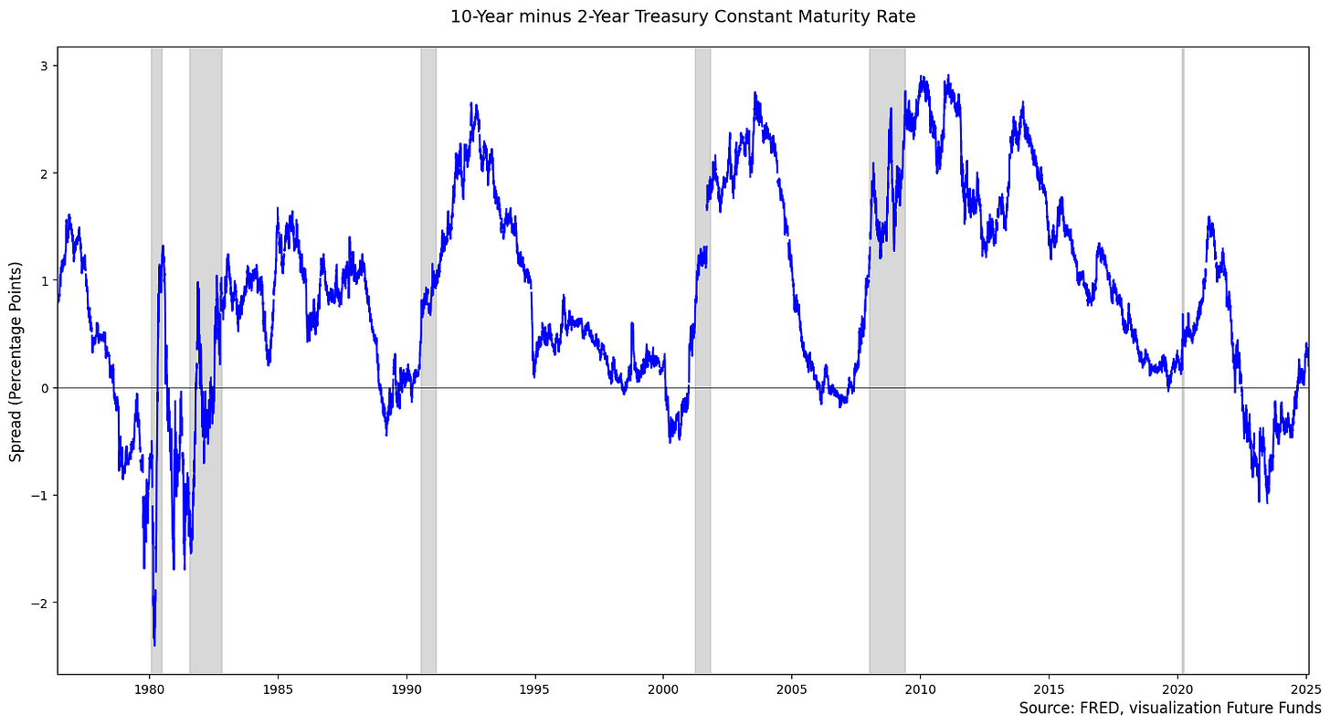 The yield curve, specifically its un-inversion point, has historically served as a reliable indicator for economic transitions. As shown in Figure 2, the spread between 10-year and 2-year Treasury rates provides crucial insights into potential economic shifts. The historical data presented in the figure demonstrates a consistent pattern: when an inverted yield curve returns to normal, significant economic events tend to follow.