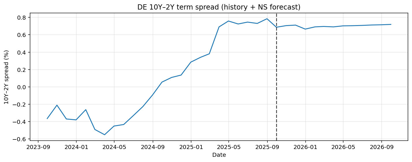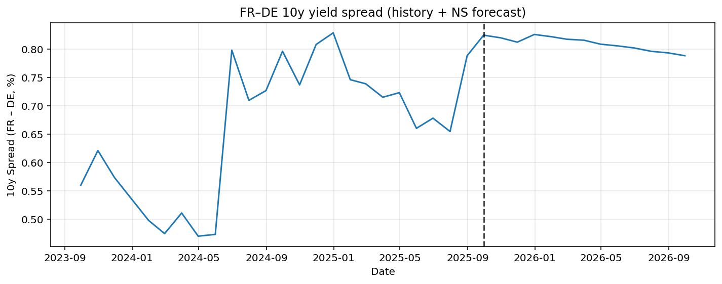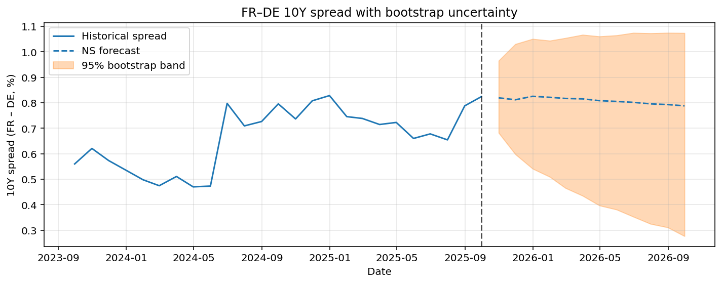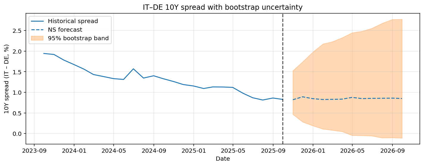 In this article, a Nelson Siegel model is used to forecast government bond yield curves and yield spreads for Germany, France, and Italy. The model fits the historical yield curves reasonably well, but the point forecasts themselves are mostly flat over the next year and come with a lot of uncertainty. The more interesting results come from the confidence bands. These bands are wide and clearly asymmetric, meaning that the risks are not evenly balanced. For some spreads, there is more risk on the upside, while for others the downside risk dominates. This shows that even when the expected change in spreads is small, the direction of risk can still matter. Overall, this type of model is better suited for understanding uncertainty and risk around yield spreads than for making precise point predictions.