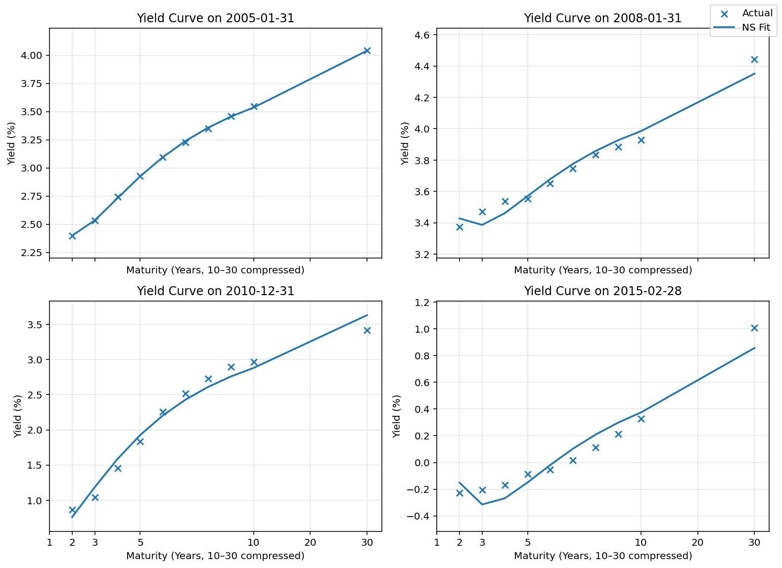 A more detailed derivation for interested readers can be found in the Appendix A1. The yield curve is fitted at each data point available. For illustration, in Figure 2, four different dates in Germany’s yield curve history are presented with the fitted Nelson Siegel model.