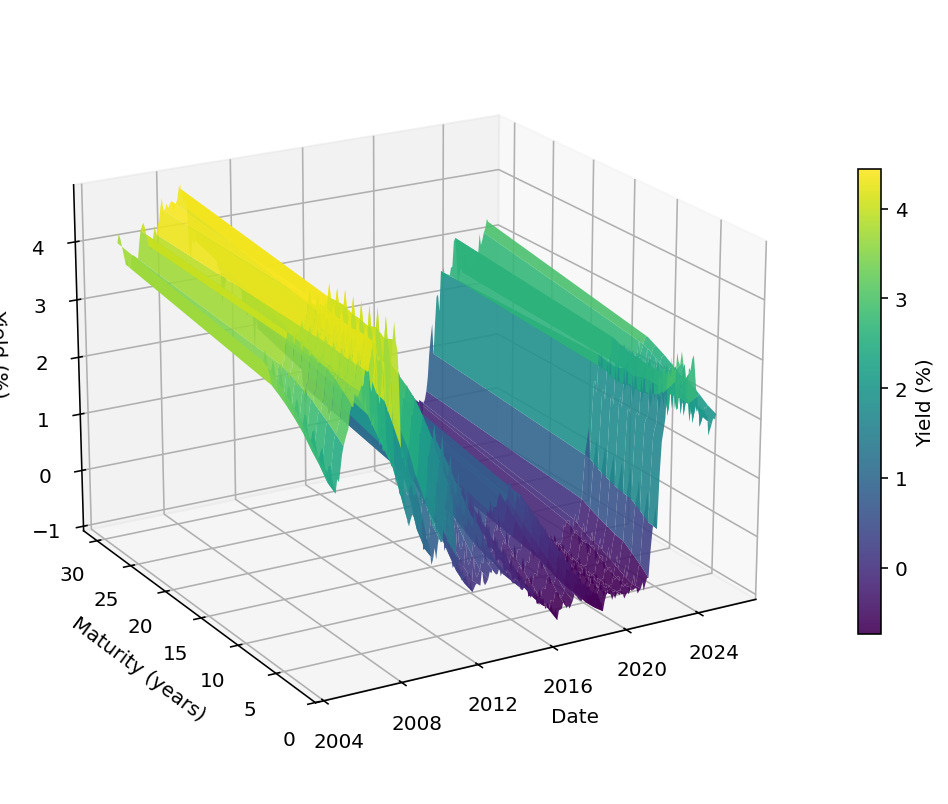 The data consists of monthly bond yields for Italy, France, and Germany starting from 01-01-2005 up to 30-09-2025. The data shows the yields of bonds with maturities 2,3,4,5,6,7,8,9,10 and 30 years and the data is sourced from Bloomberg. Figure 1 contains a visual representation of the various bond yields of Germany over time. At the start of this timeline the bond yields were higher, around 4%. Halfway through the considered timeline bond yields were low. More recently the bond yields have been going up again, partly due to the halting of the Asset Purchasing Programme of the ECB, discussed in this earlier article.