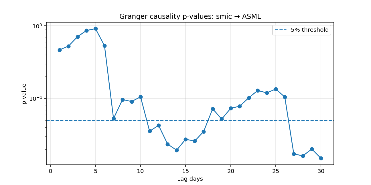 I performed the same test with the other clients of ASML to check for similarities. For SK Hynix there was no predictive power according to the test and given the data. For the other clients SMIC, Intel, and Samsung there was significant predictive power. For intel we have similar results to TSM, historical prices have predictive prices for the returns of ASML, and yesterday's price is the best predictor. For Samsung Electronics only the past two days of returns have a significant predictive effect. And suprisingly, for SMIC only higher lags have significant predictive power. Namely the return of the past 30 days seem to have a significant effect on the return of ASML.