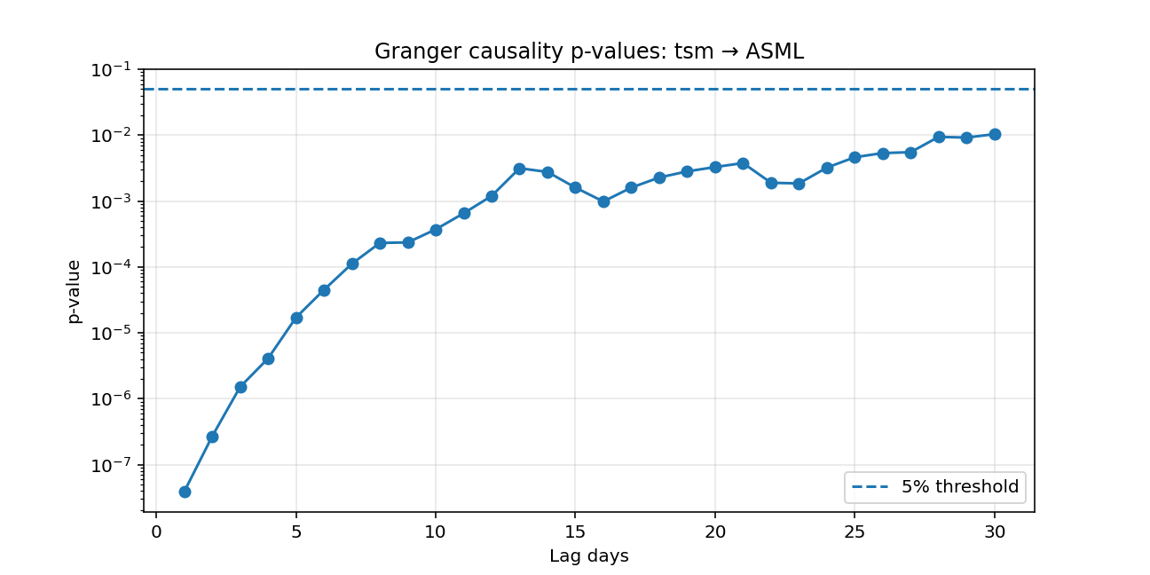 Where yᵢ is the current observed return of ASML and the first sum contains all the lagged previous returns of ASML with coefficients αᵢ. The second sum contains previous observed returns of TSM with coefficients βᵢ. The test determines if the coefficients of TSM are significantly different from zero or not, i.e., if they have any predictive value.