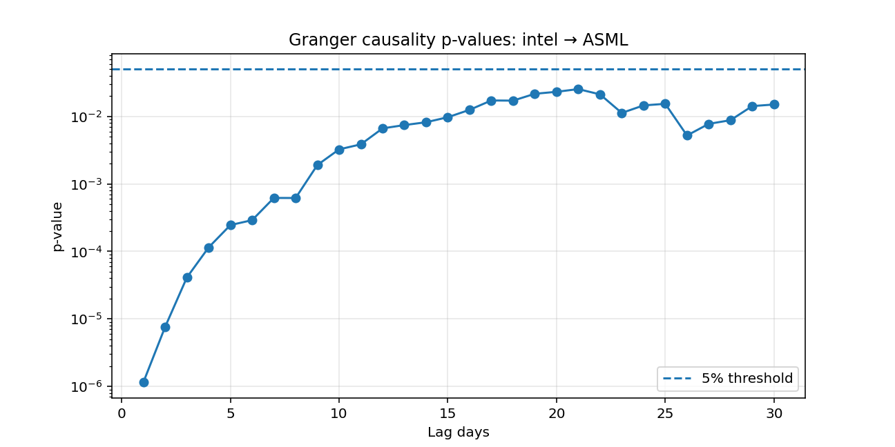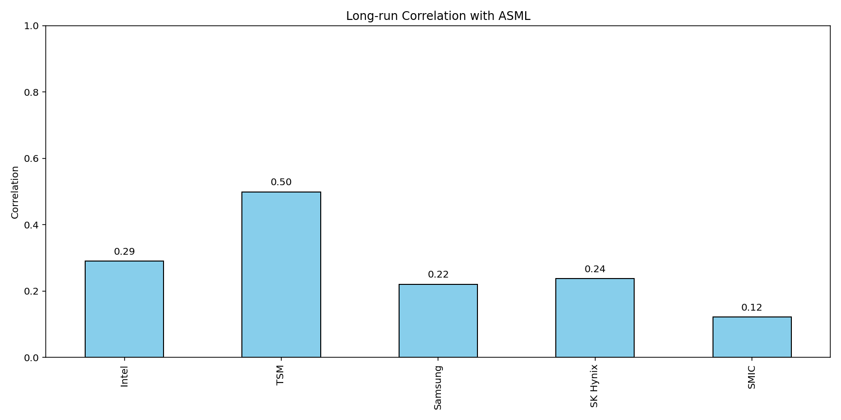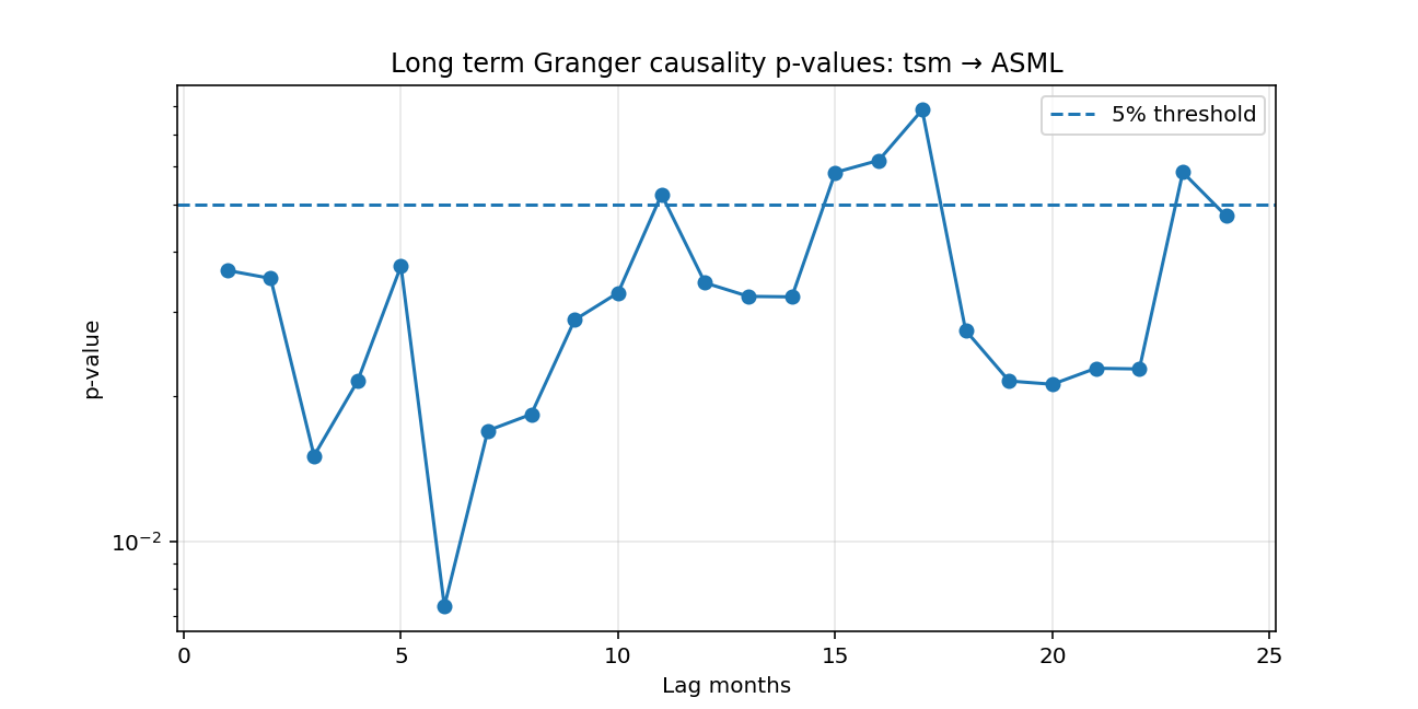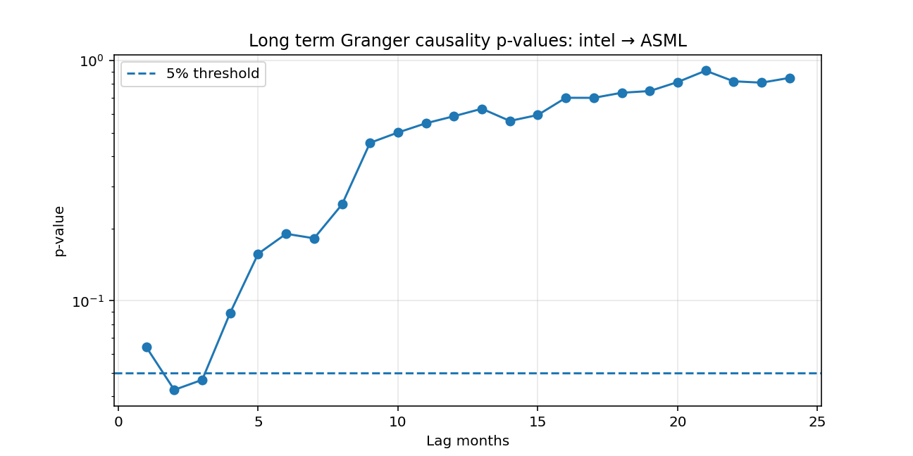 Intel returns seem to have significant predictive capabilities with 2-3 months of lagged returns, so still not quite long term effects. However, for TSM we see many lags of historical prices that seem to have significant predictive power. The most significant seems to be 6 months of lag, so the returns of the past 6 months of TSM are the best indicator of ASML's share return according to the Granger test. Most lagged monthly retuns of TSM are significant predictors of ASML's return according to the Granger test. It seems TSM is a strongly intertwined client of ASML whose share price are more connected compared to the other clients.