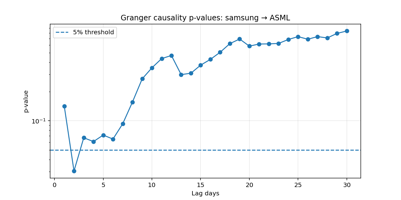 According to the Granger causality test the returns of TMS hold significant predictive value over the return of ASML on a given day. The specific strength of predictability is not determined with this model. We only know the historic returns of TMS are an indicator of the ASML returns. In the graph below we see the lags (amount of previous TMS returns used to estimate the ASML return on a day). The y-axis contains the p-value for different amount of historical returns of TSM as predictors. The y-axis contains the p-value, a lower p-value means we are more certain there is an effect. The best predictor is using the previous day's return of TMS. That is in a sense intuitive, older returns carry less information compared to yesterday's return. Since the model is based on ASML's past returns and TSM past returns, it indicates the added value of using TSM returns besides only using ASML returns. Important to note is that we have not found a direction of the effect, the direction of the effect can be different for various lags.