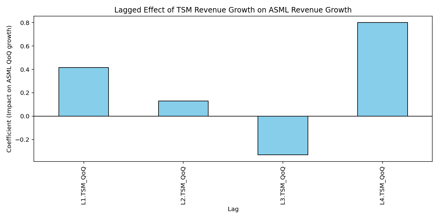The tests performed above are all based on the share price. This price is ofcourse subject to many factors like speculation. As a quick check I performed the same test to the year-on-year quarterly revenue growth rates, and the quarter-on-quarter revenue growth rates of tsm and asml. I chose to use them both to see if the revenue growth rate has some predictive effect or exist due to seasonality. I found that using the past four quarterly growth rates of tsm has significant preditive value over the next quarterly growth rate of asml. Investigating the coefficients of the lagged model we can see the fourth lag of the quarterly growth has the highest coefficient. This is true for both versions of the quarterly revenue. This is in line with our thoughts: It takes a while for increasing demand in chips to reach ASML. The model finds that an increase in quarterly year-on-year revenue will influence ASML the most exactly one year in the future. On shorter term there is also effect, but the effect is strongest one year into the future.